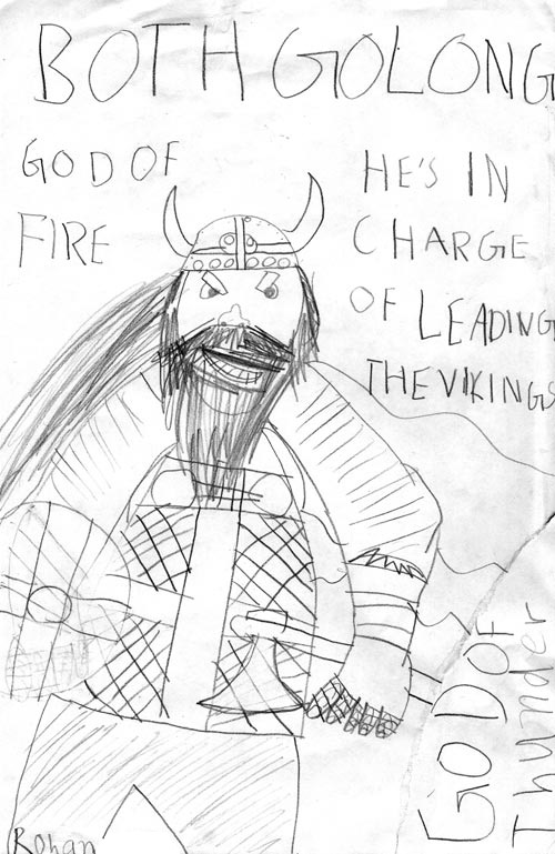 Here’s some viking god designs from Rohan and Christian in Kalgoorlie: a colourful version of Thor, and a hairy bloke called ‘Bothgolong’, the god of fire and leading the Vikings.