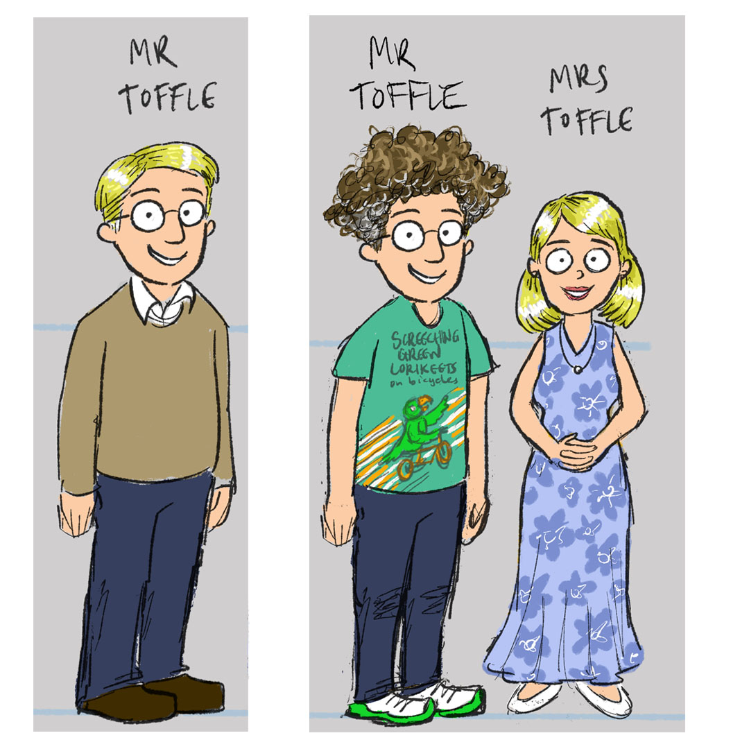 Previous Image Next Image Toffle Towers first sketch – parents colour v1 and v2 of Mr Toffle, and v1 of Mrs Toffle