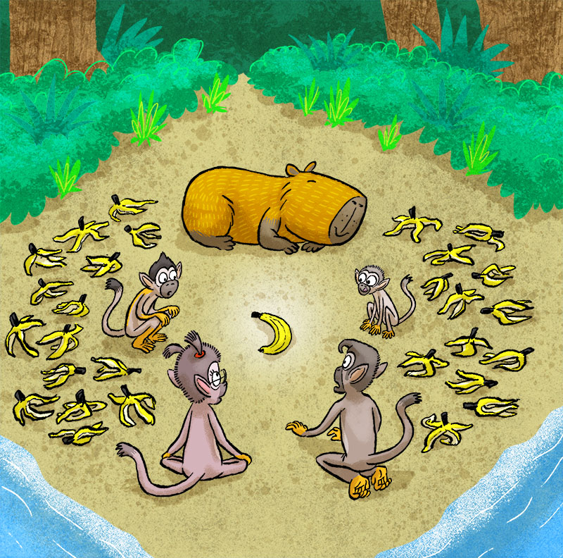 Happy Barry Capybara is the most chilled-out animal on the savannah. But when his friend the cheeky squirrel monkey, Harry, and his cousins are fighting over the last banana, Barry is left to decide who will get it. Which monkey will win the favour of Barry? Or will Barry have a new lesson to teach them about what it means to share?